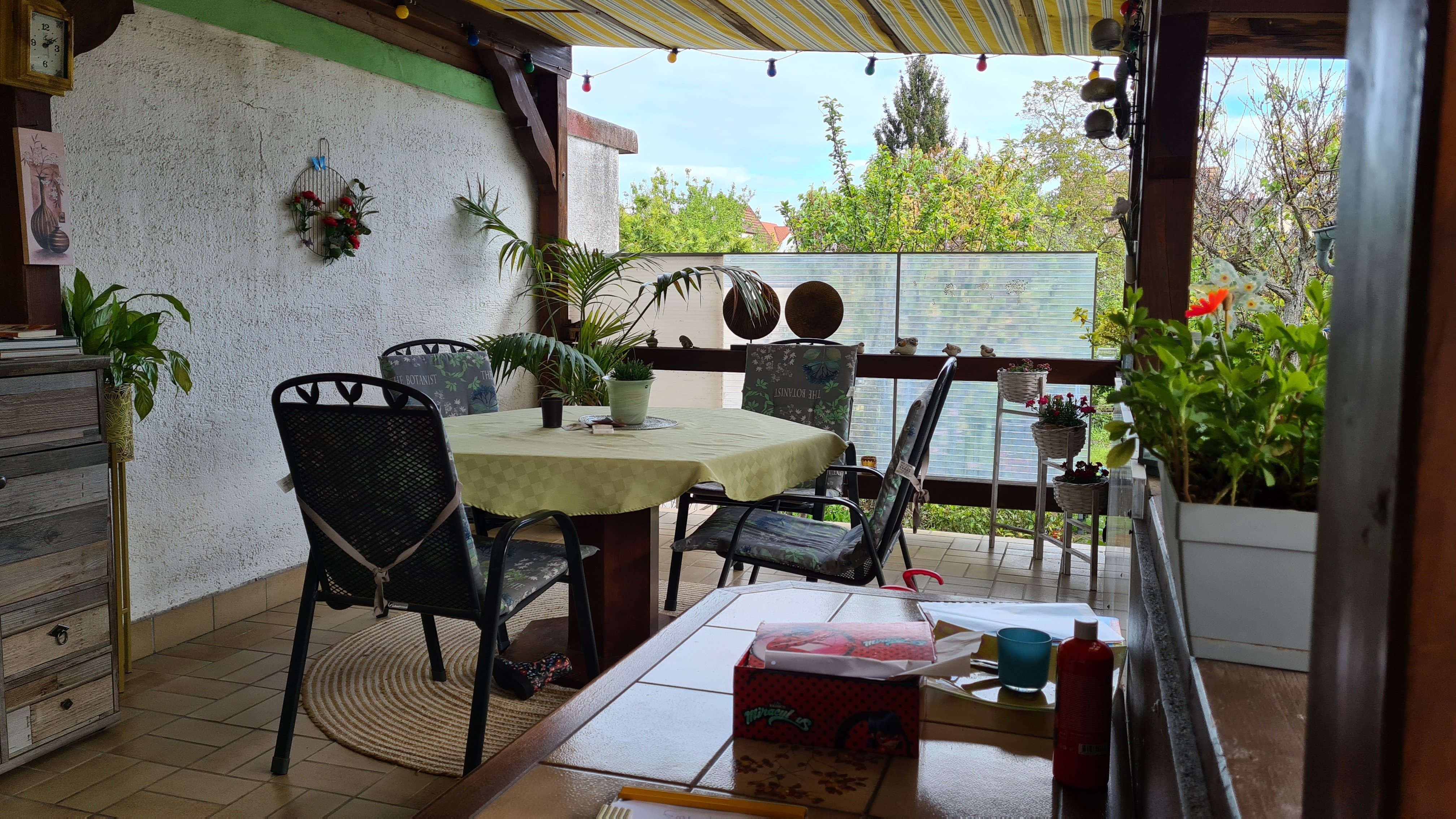 Die Veranda bietet an sonnigen, aber auch regnerischen Tagen eine schöne Gelegenheit, um draußen sitzen zu können. Ein kleiner Garten lädt zum Spielen und Gärtnern ein.